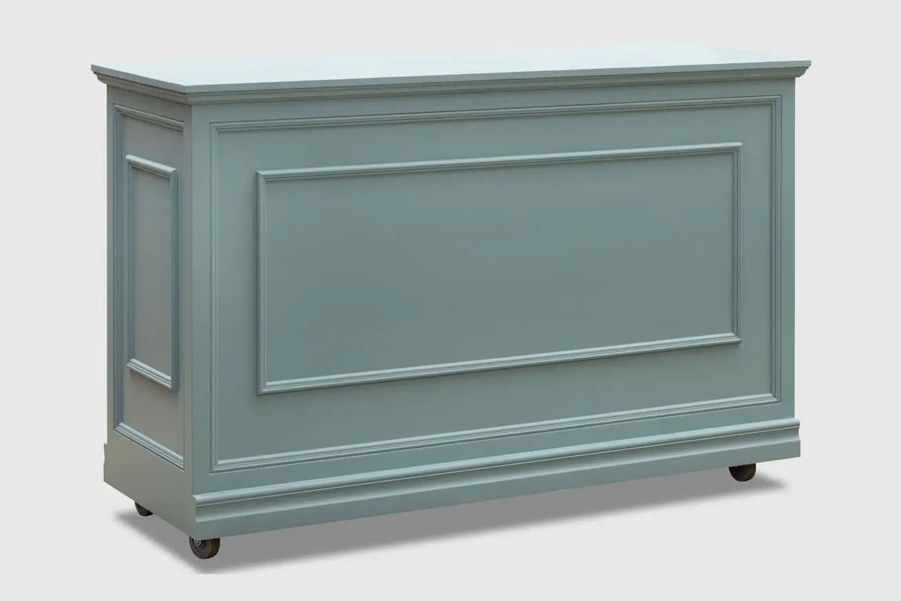 Aqua Blue Wooden Bar with 2 Back Shelves on Casters.