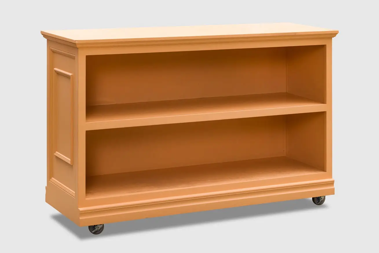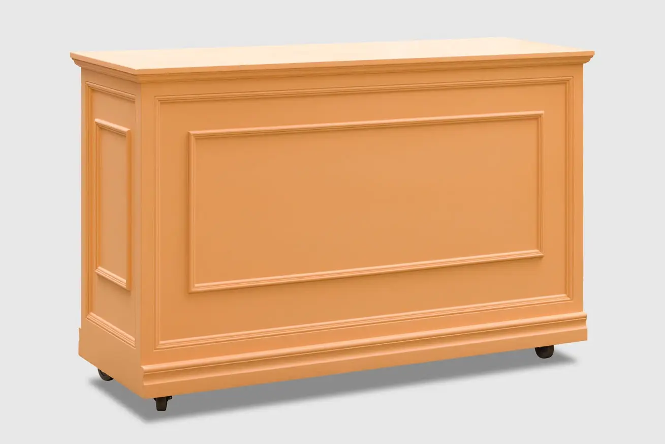 pastel Orange Wooden Bar with 2 Back Shelves on Casters.