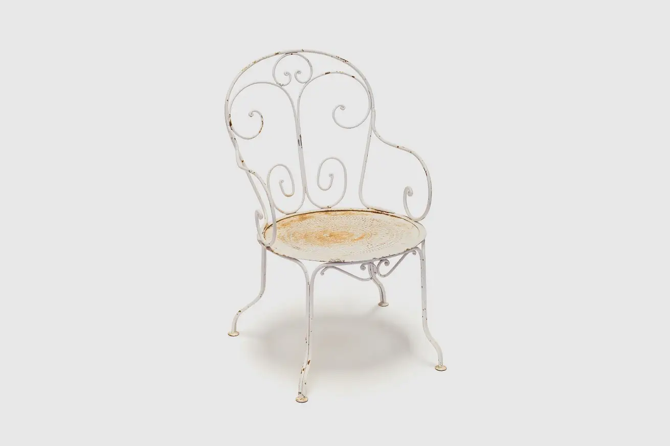 Perforated White Garden Chair from France with Round Metal Seat and Arms.