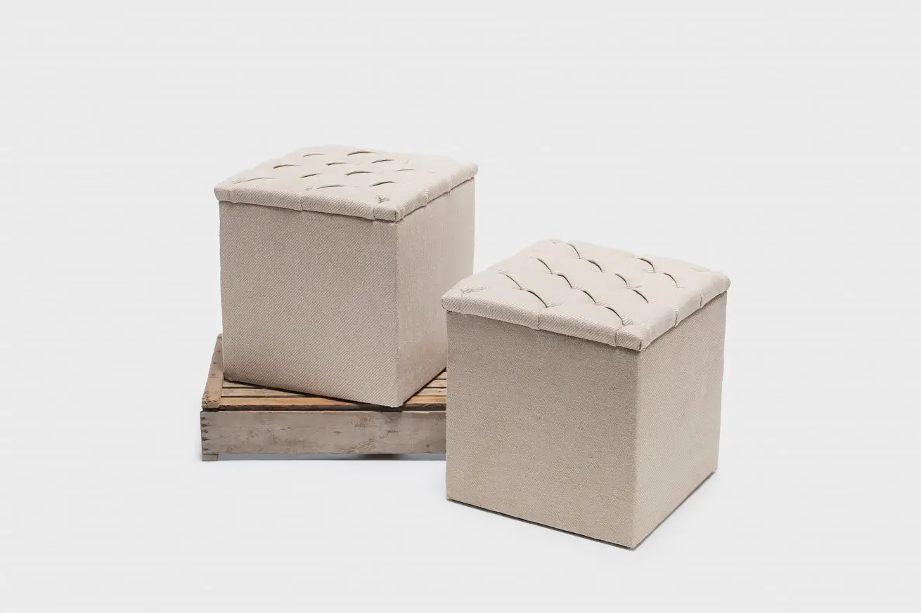 Set of 2 Beige Textured Poufs with Tufted Top.