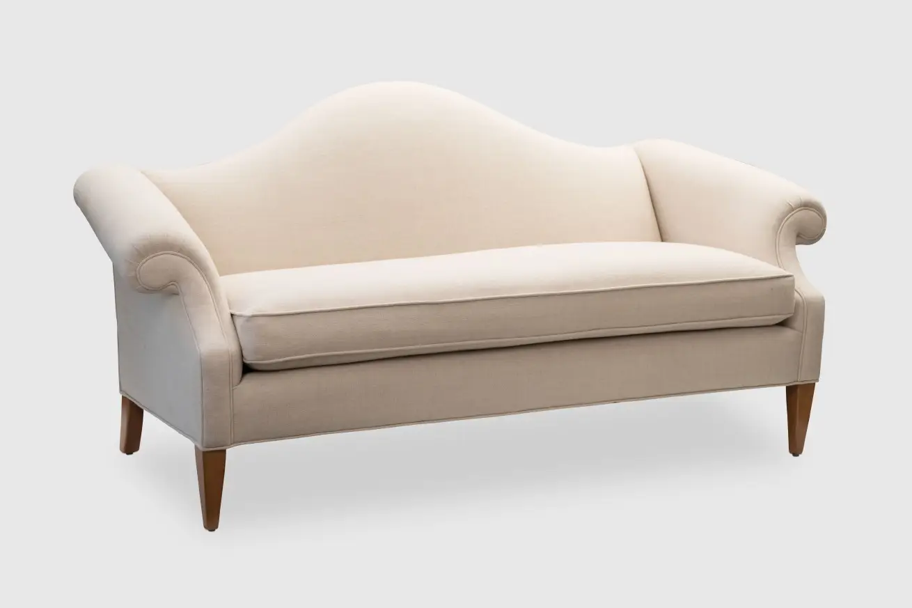 Beige Upholstered Camel Back Sofa.