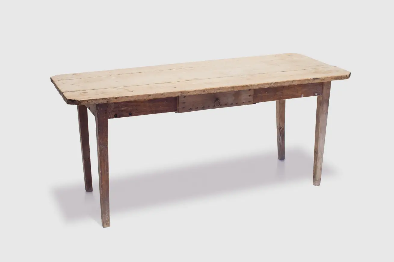 5.5 Foot Long Farmhouse Table with Beveled Corners and Side Rivets.