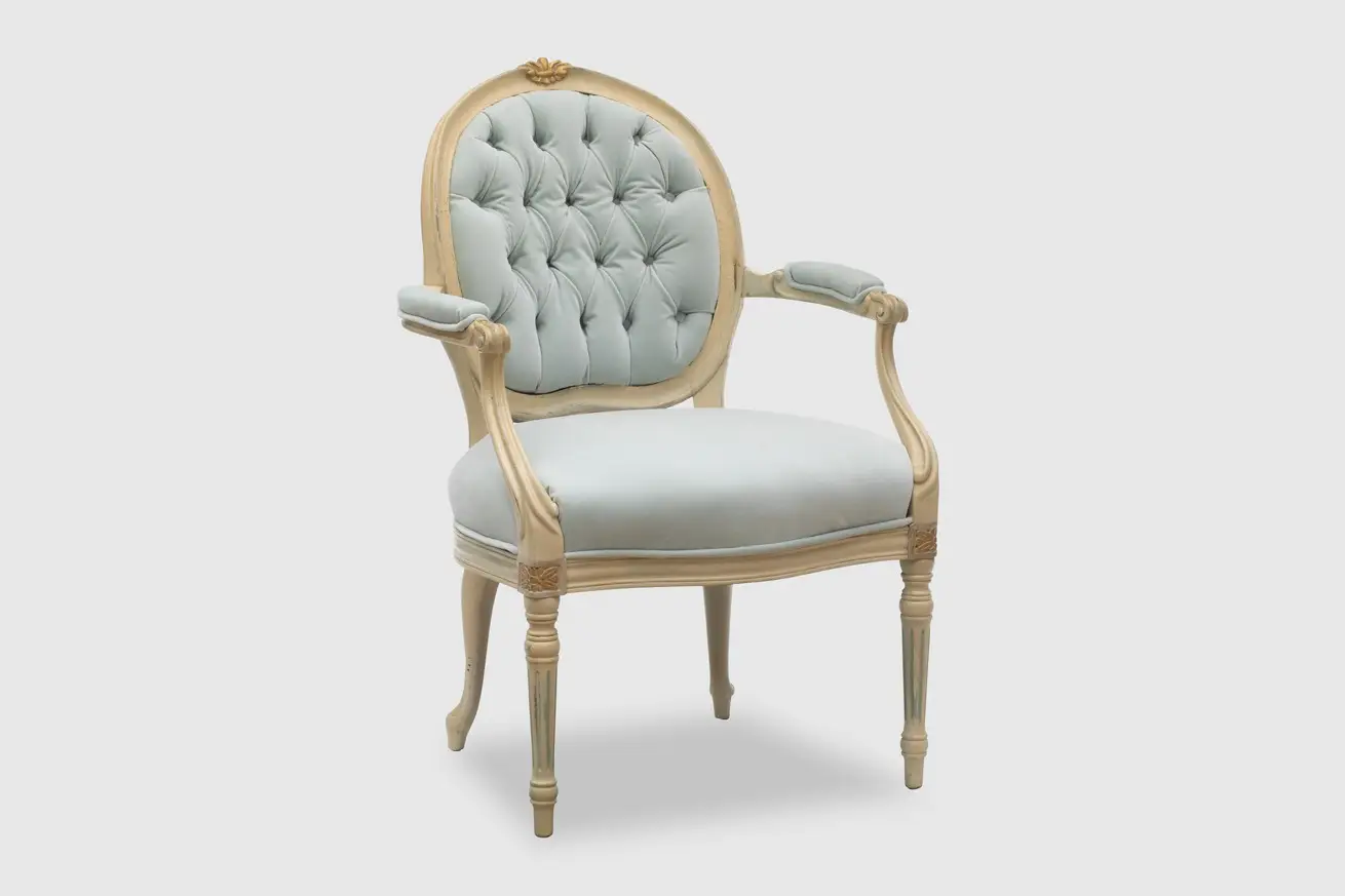 Light Blue Tufted Velvet Chair with Painted Frame and Gold Detail.